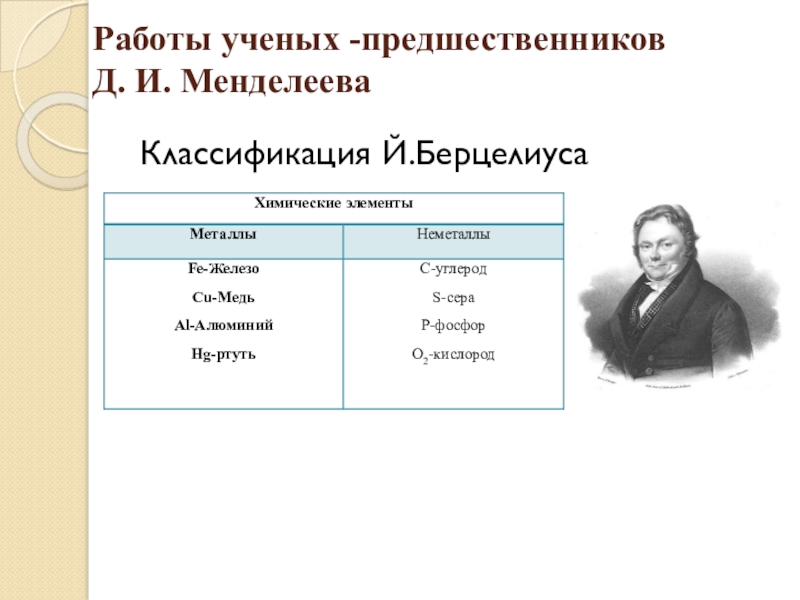 Работы ученых -предшественников  Д. И. Менделеева Классификация Й.Берцелиуса