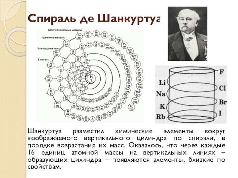 Спираль де Шанкуртуа Шанкуртуа разместил химические элементы вокруг воображаемого вертикального цилиндра по спирали, в порядке возрастания их