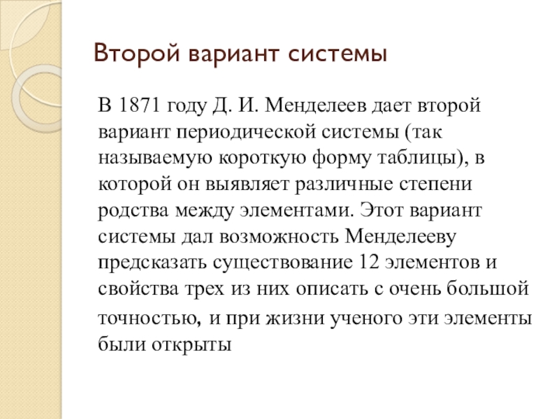 периодической системы (так называемую короткую форму таблицы), в которой он выявляет различные степени родства между элементами. Этот вариант системы дал возможность Менделееву предсказать существование 12 элементов и свойства трех из них описать с очень большой точностью, и при жизни ученого эти элементы были открыты