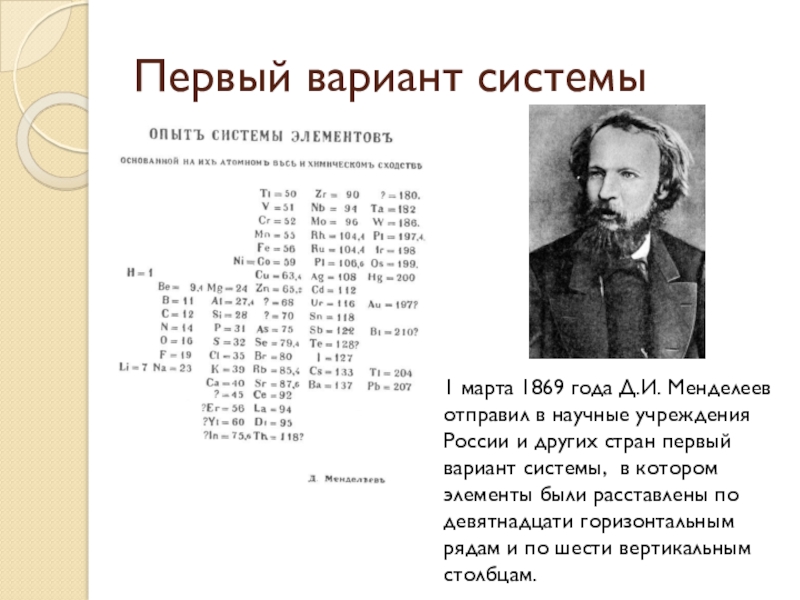 Первый вариант системы1 марта 1869 года Д.И. Менделеев отправил в научные учреждения России и других стран первый