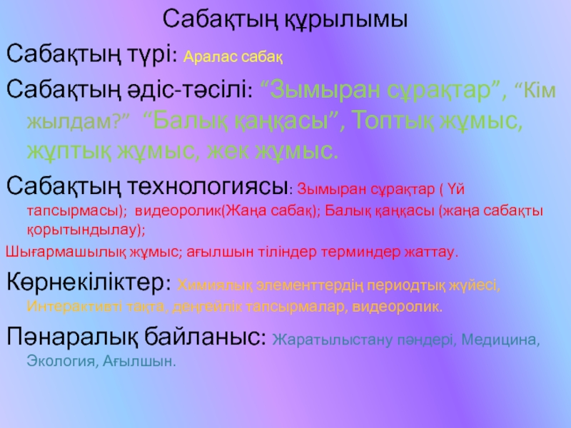 Сабақтың технологиясы: Зымыран сұрақтар ( Үй тапсырмасы); видеоролик(Жаңа сабақ); Балық қаңқасы (жаңа сабақты қорытындылау);