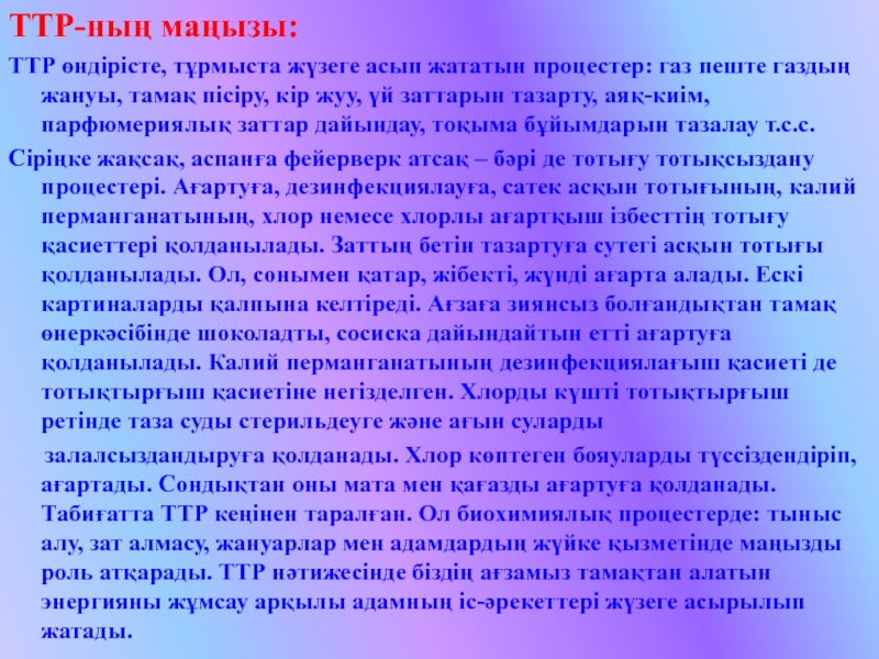 залалсыздандыруға қолданады. Хлор көптеген бояуларды түссіздендіріп, ағартады. Сондықтан оны мата мен қағазды ағартуға қолданады. Табиғатта ТТР кеңінен таралған. Ол биохимиялық процестерде: тыныс алу, зат алмасу, жануарлар мен адамдардың жүйке қызметінде маңызды роль атқарады. ТТР нәтижесінде біздің ағзамыз тамақтан алатын энергияны жұмсау арқылы адамның іс-әрекеттері жүзеге асырылып жатады.