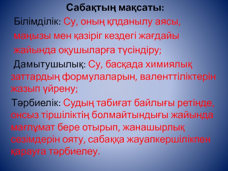 Тәрбиелік: Судың табиғат байлығы ретінде, онсыз тіршіліктің болмайтындығы жайында мағлұмат бере отырып, жанашырлық сезімдерін ояту, сабаққа жауапкершілікпен қарауға тәрбиелеу.
