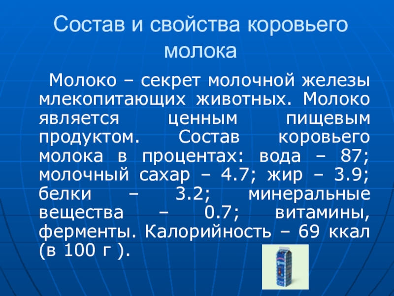 млекопитающих животных. Молоко является ценным пищевым продуктом. Состав коровьего молока в процентах: вода – 87; молочный сахар – 4.7; жир – 3.9; белки – 3.2; минеральные вещества – 0.7; витамины, ферменты. Калорийность – 69 ккал (в 100 г ).