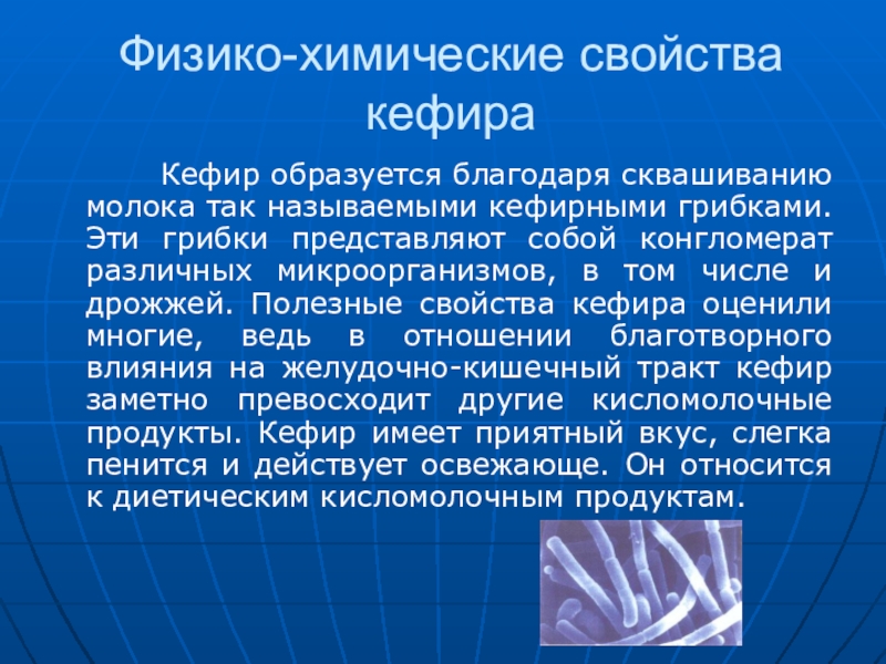 молока так называемыми кефирными грибками. Эти грибки представляют собой конгломерат различных микроорганизмов, в том числе и дрожжей. Полезные свойства кефира оценили многие, ведь в отношении благотворного влияния на желудочно-кишечный тракт кефир заметно превосходит другие кисломолочные продукты. Кефир имеет приятный вкус, слегка пенится и действует освежающе. Он относится к диетическим кисломолочным продуктам.