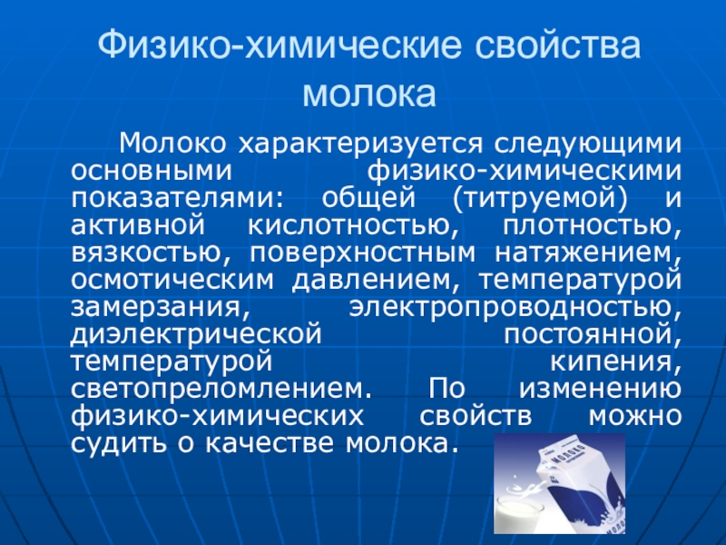 показателями: общей (титруемой) и активной кислотностью, плотностью, вязкостью, поверхностным натяжением, осмотическим давлением, температурой замерзания, электропроводностью, диэлектрической постоянной, температурой кипения, светопреломлением. По изменению физико-химических свойств можно судить о качестве молока.