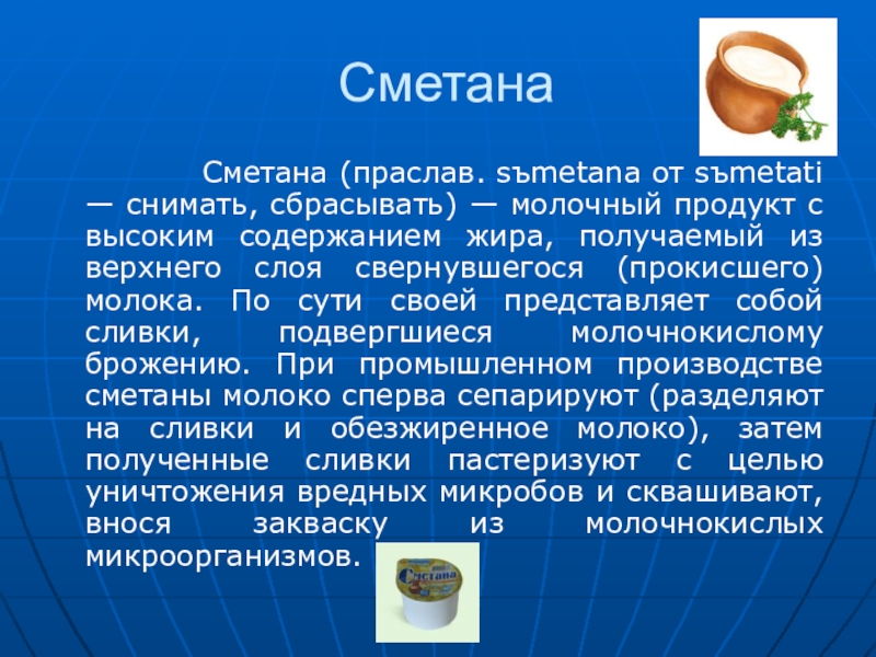 sъmetati — снимать, сбрасывать) — молочный продукт с высоким содержанием жира, получаемый из верхнего слоя свернувшегося (прокисшего) молока. По сути своей представляет собой сливки, подвергшиеся молочнокислому брожению. При промышленном производстве сметаны молоко сперва сепарируют (разделяют на сливки и обезжиренное молоко), затем полученные сливки пастеризуют с целью уничтожения вредных микробов и сквашивают, внося закваску из молочнокислых микроорганизмов.