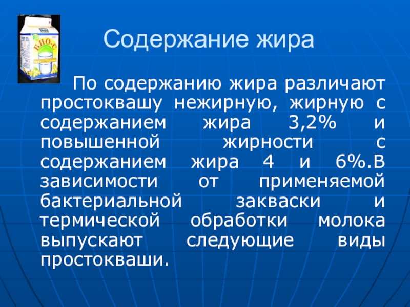 жирную с содержанием жира 3,2% и повышенной жирности с содержанием жира 4 и 6%.В зависимости от применяемой бактериальной закваски и термической обработки молока выпускают следующие виды простокваши.