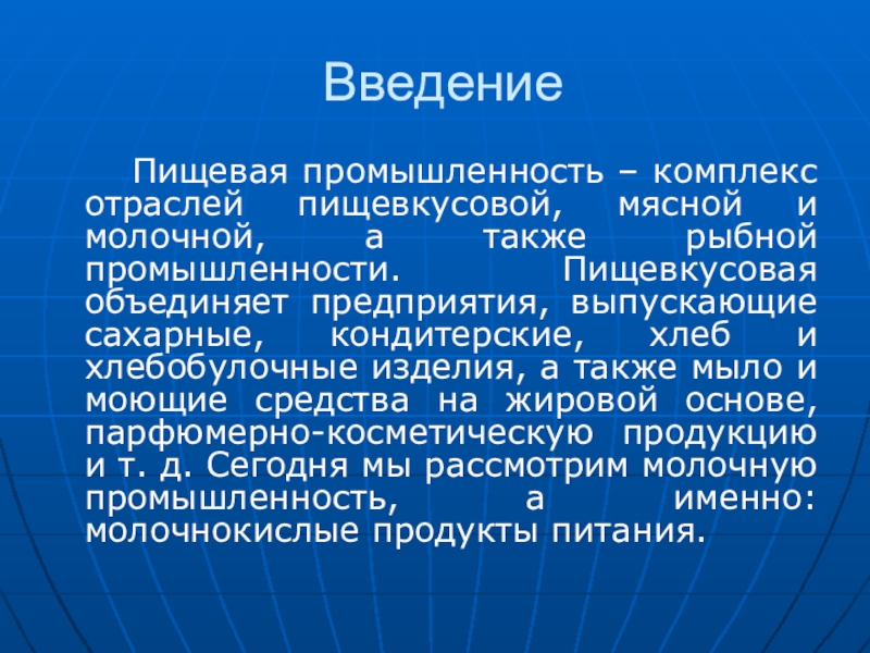 молочной, а также рыбной промышленности. Пищевкусовая объединяет предприятия, выпускающие сахарные, кондитерские, хлеб и хлебобулочные изделия, а также мыло и моющие средства на жировой основе, парфюмерно-косметическую продукцию и т. д. Сегодня мы рассмотрим молочную промышленность, а именно: молочнокислые продукты питания.