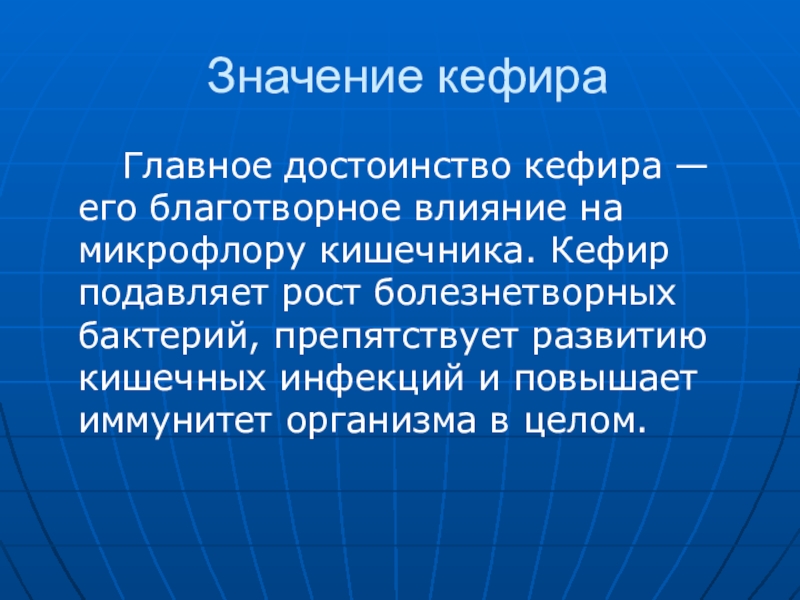 на микрофлору кишечника. Кефир подавляет рост болезнетворных бактерий, препятствует развитию кишечных инфекций и повышает иммунитет организма в целом.