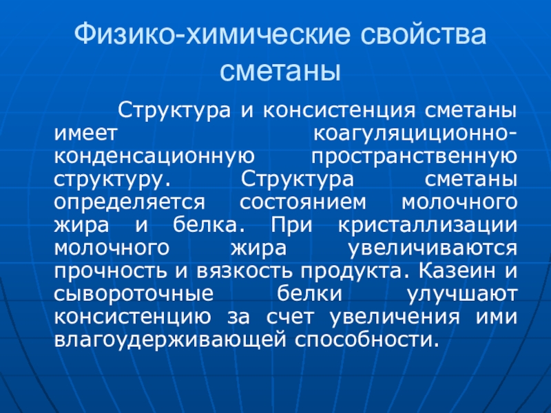 имеет коагуляциционно-конденсационную пространственную структуру. Структура сметаны определяется состоянием молочного жира и белка. При кристаллизации молочного жира увеличиваются прочность и вязкость продукта. Казеин и сывороточные белки улучшают консистенцию за счет увеличения ими влагоудерживающей способности.