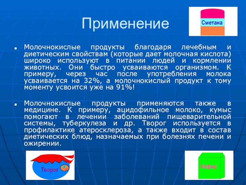 широко используют в питании людей и кормлении животных. Они быстро усваиваются организмом. К примеру, через час после употребления молока усваивается на 32%, а молочнокислый продукт к тому моменту усвоится уже на 91%!