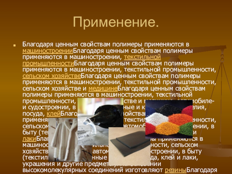 в машиностроении, текстильной промышленностиБлагодаря ценным свойствам полимеры применяются в машиностроении, текстильной промышленности, сельском хозяйствеБлагодаря ценным свойствам полимеры применяются в машиностроении, текстильной промышленности, сельском хозяйстве и медицинеБлагодаря ценным свойствам полимеры применяются в машиностроении, текстильной промышленности, сельском хозяйстве и медицине, автомобиле- и судостроении, в быту (текстильные и кожевенные изделия, посуда, клейБлагодаря ценным свойствам полимеры применяются в машиностроении, текстильной промышленности, сельском хозяйстве и медицине, автомобиле- и судостроении, в быту (текстильные и кожевенные изделия, посуда, клей и лакиБлагодаря ценным свойствам полимеры применяются в машиностроении, текстильной промышленности, сельском хозяйстве и медицине, автомобиле- и судостроении, в быту (текстильные и кожевенные изделия, посуда, клей и лаки, украшения и другие предметы). На основании высокомолекулярных соединений изготовляют резиныБлагодаря ценным свойствам полимеры применяются в машиностроении, текстильной промышленности, сельском хозяйстве и медицине, автомобиле- и судостроении, в быту (текстильные и кожевенные изделия, посуда, клей и лаки, украшения и другие предметы). На основании высокомолекулярных соединений изготовляют резины, волокнаБлагодаря ценным свойствам полимеры применяются в машиностроении, текстильной промышленности, сельском хозяйстве и медицине, автомобиле- и судостроении, в быту (текстильные и кожевенные изделия, посуда, клей и лаки, украшения и другие предметы). На основании высокомолекулярных соединений изготовляют резины, волокна, пластмассы, пленки и лакокрасочные покрытия. Все ткани живых организмов представляют высокомолекулярные соединения.
