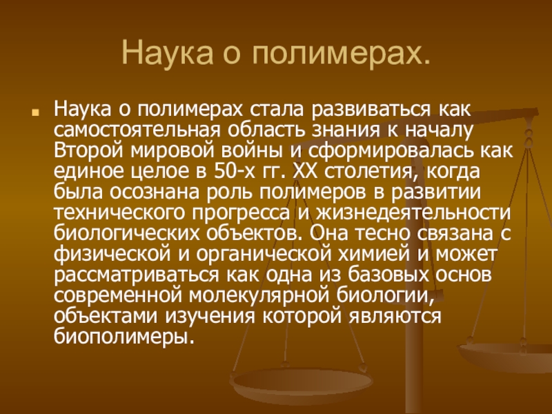 к началу Второй мировой войны и сформировалась как единое целое в 50-х гг. XX столетия, когда была осознана роль полимеров в развитии технического прогресса и жизнедеятельности биологических объектов. Она тесно связана с физической и органической химией и может рассматриваться как одна из базовых основ современной молекулярной биологии, объектами изучения которой являются биополимеры.