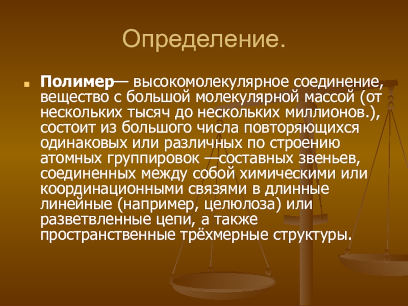 Полимер— высокомолекулярное соединение, вещество с большой молекулярной массой (от нескольких тысяч