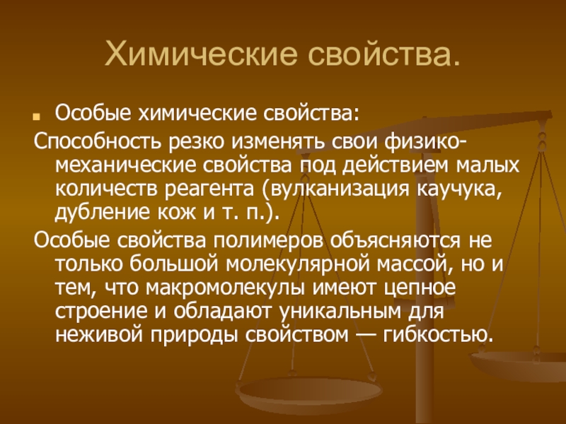 Особые свойства полимеров объясняются не только большой молекулярной массой, но и тем, что макромолекулы имеют цепное строение и обладают уникальным для неживой природы свойством — гибкостью.