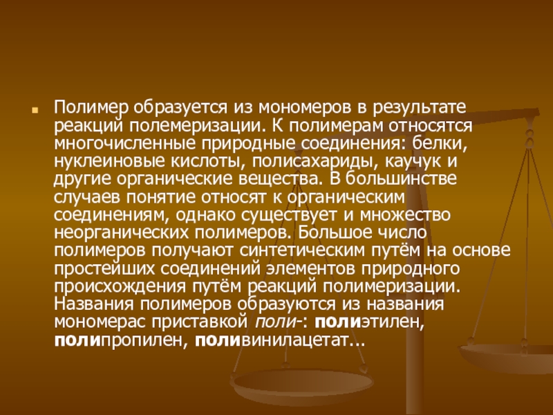 Полимер образуется из мономеров в результате реакций полемеризации. К полимерам относятся