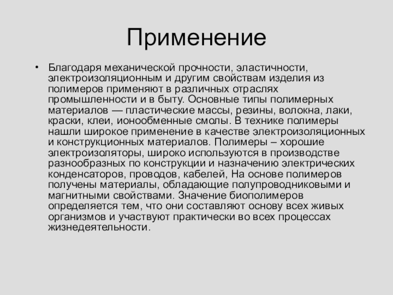применяют в различных отраслях промышленности и в быту. Основные типы полимерных материалов — пластические массы, резины, волокна, лаки, краски, клеи, ионообменные смолы. В технике полимеры нашли широкое применение в качестве электроизоляционных и конструкционных материалов. Полимеры – хорошие электроизоляторы, широко используются в производстве разнообразных по конструкции и назначению электрических конденсаторов, проводов, кабелей, На основе полимеров получены материалы, обладающие полупроводниковыми и магнитными свойствами. Значение биополимеров определяется тем, что они составляют основу всех живых организмов и участвуют практически во всех процессах жизнедеятельности.