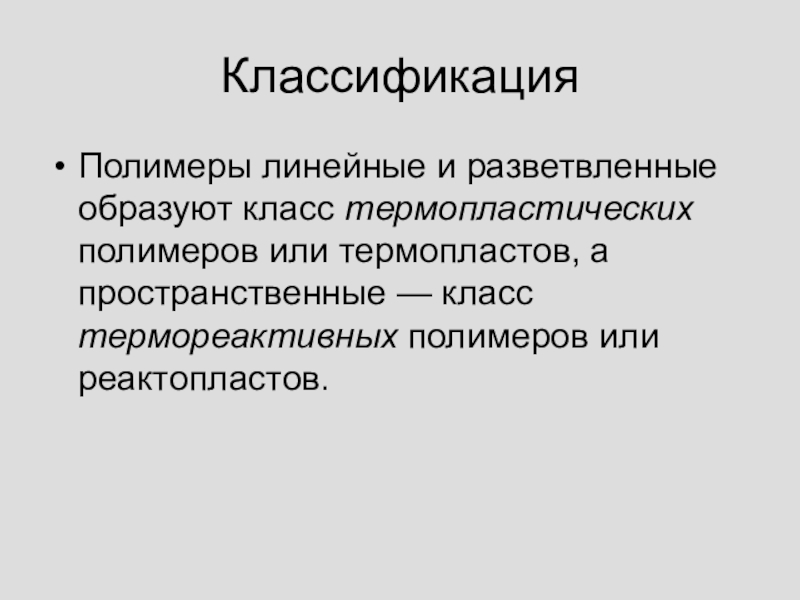 КлассификацияПолимеры линейные и разветвленные образуют класс термопластических полимеров или термопластов, а пространственные — класс термореактивных полимеров или