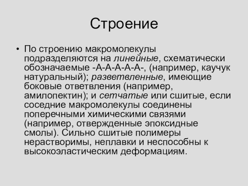 СтроениеПо строению макромолекулы подразделяются на линейные, схематически обозначаемые -А-А-А-А-А-, (например, каучук натуральный); разветвленные, имеющие боковые ответвления (например,