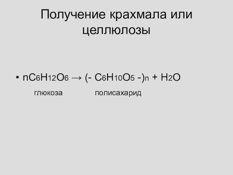 Получение крахмала или целлюлозыnС6Н12О6 → (- С6Н10О5 -)n + Н2О    глюкоза