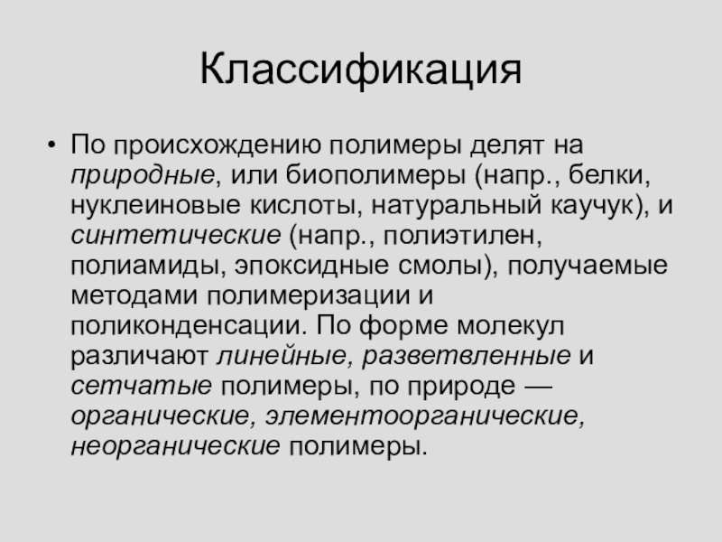 По происхождению полимеры делят на природные, или биополимеры (напр., белки, нуклеиновые