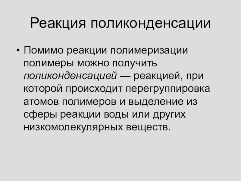 Реакция поликонденсацииПомимо реакции полимеризации полимеры можно получить поликонденсацией — реакцией, при которой происходит перегруппировка атомов полимеров и