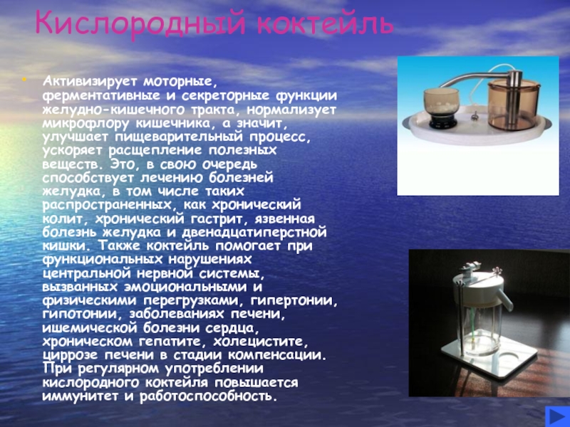 Применение его в медицине основано на использовании кислородных коктейлей, кислородных подушек и т. д.