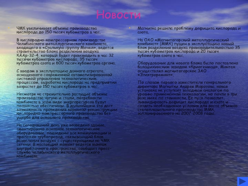 На ОАО «Магнитогорский металлургический комбинат» (ММК) пущен в эксплуатацию новый блок разделения воздуха производительностью 35 тысяч кубометров кислорода и 20 тысяч кубометров азота в час.