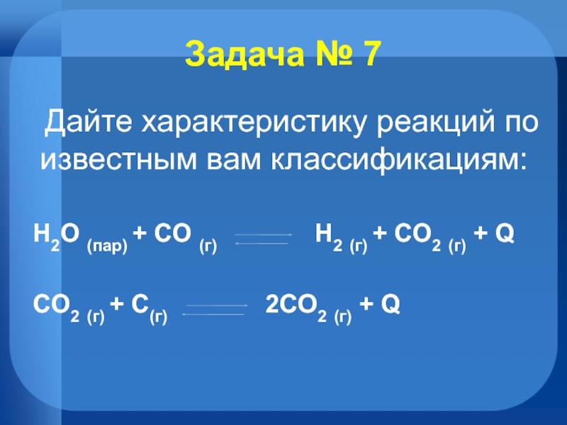 Задача № 7  Дайте характеристику реакций по известным вам классификациям:  H2O (пар) + СO (г)