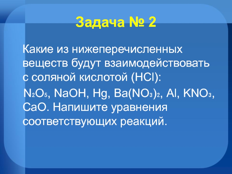 Задача № 2  Какие из нижеперечисленных веществ будут взаимодействовать с соляной кислотой (HCl):  N₂O₅, NaOH,