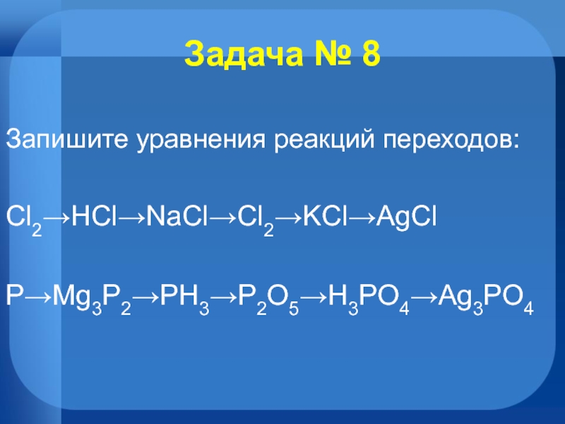 Задача № 8Запишите уравнения реакций переходов:Cl2→HCl→NaCl→Cl2→KCl→AgClP→Mg3P2→PH3→P2O5→H3PO4→Ag3PO4