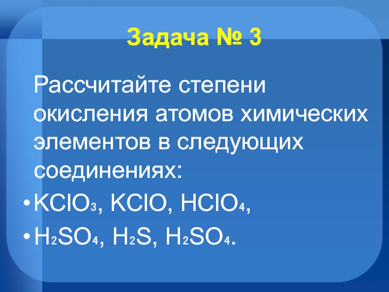 Задача № 3  Рассчитайте степени окисления атомов химических элементов в следующих соединениях: KClO₃, KClO, HClO₄,H₂SO₄, H₂S,