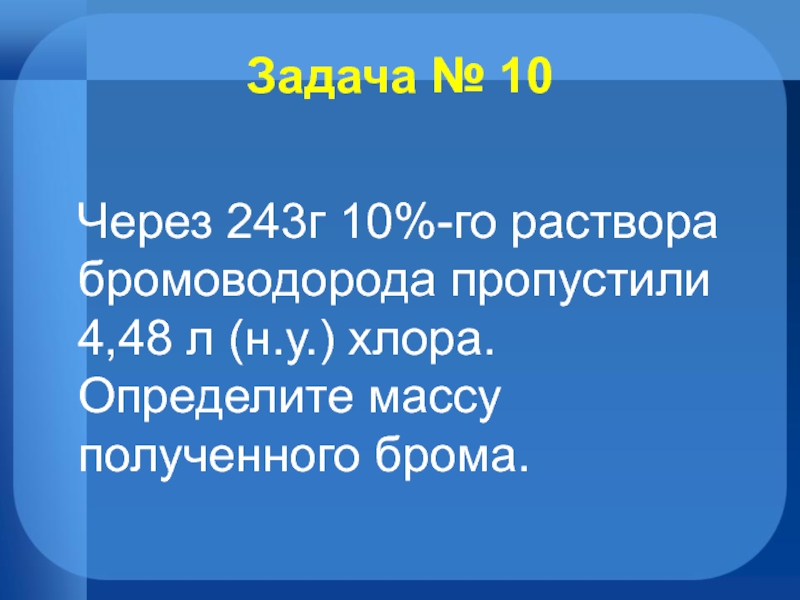 Задача № 10  Через 243г 10%-го раствора бромоводорода пропустили 4,48 л (н.у.) хлора. Определите массу полученного