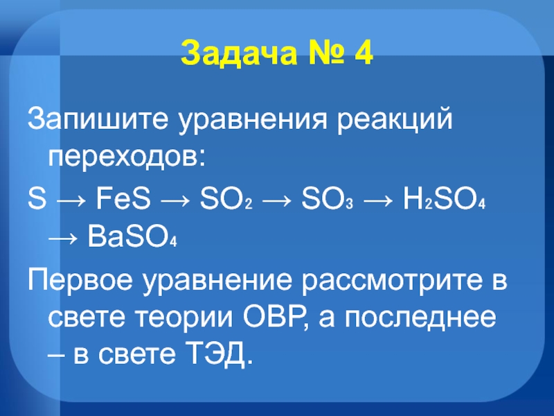 Задача № 4Запишите уравнения реакций переходов:S → FeS → SO₂ → SO₃ → H₂SO₄ → BaSO₄Первое уравнение