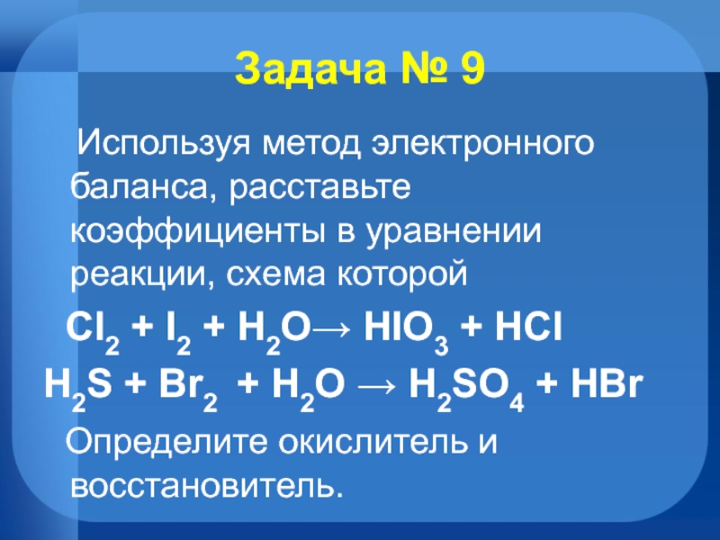 Задача № 9  Используя метод электронного баланса, расставьте коэффициенты в уравнении реакции, схема которой Cl2 + I2 + H2O→ HIO3 + HClH2S + Br2  + H2O → H2SO4 + HBr Определите