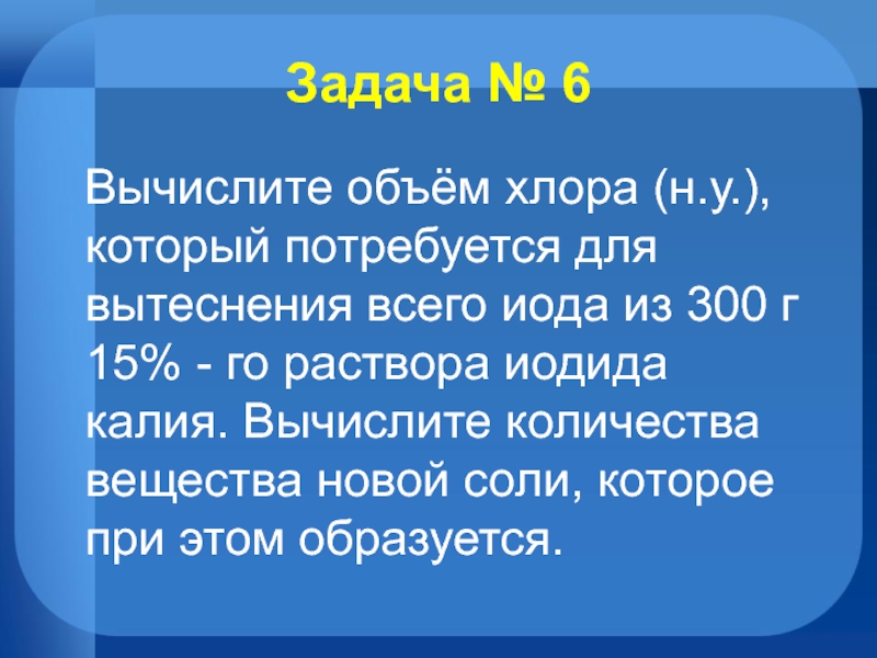 Задача № 6  Вычислите объём хлора (н.у.), который потребуется для вытеснения всего иода из 300 г