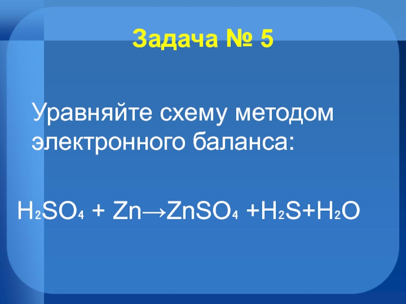 Задача № 5  Уравняйте схему методом электронного баланса:H₂SO₄ + Zn→ZnSO₄ +H₂S+H₂O