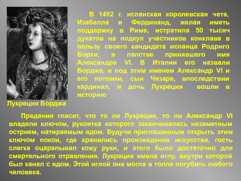 Предания гласят, что то ли Лукреция, то ли Александр VI владели ключом, рукоятка которого заканчивалась незаметным острием, натираемым ядом. Будучи приглашенным открыть этим ключом покои, где хранились произведения искусства, гость слегка оцарапывал кожу руки, и этого было достаточно для смертельного отравления. Лукреция имела иглу, внутри которой был канал с ядом. Этой иглой она могла в толпе погубить любого человека.