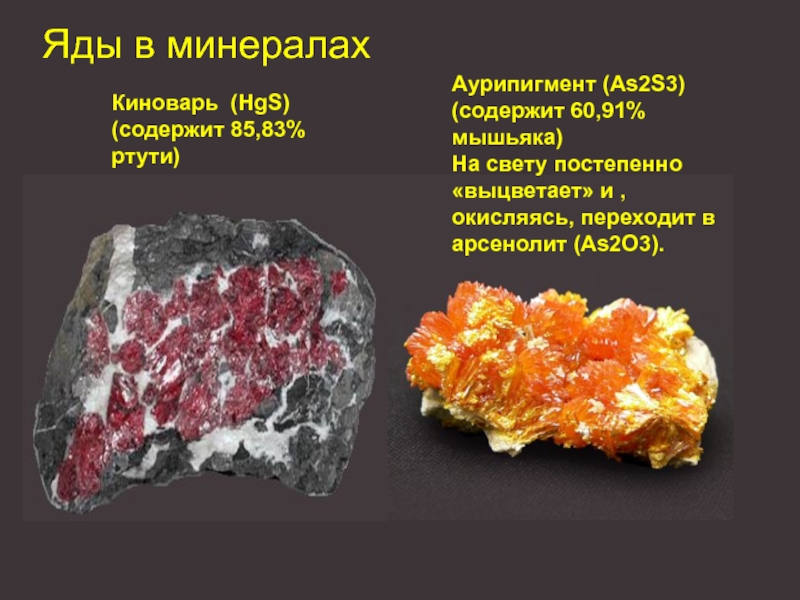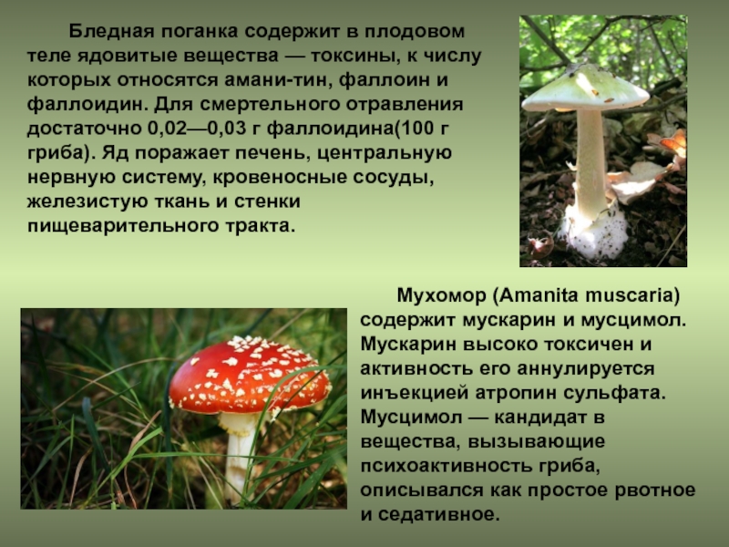 Мухомор (Amanita muscaria) содержит мускарин и мусцимол. Мускарин высоко токсичен и активность его аннулируется инъекцией атропин сульфата. Мусцимол — кандидат в вещества, вызывающие психоактивность гриба, описывался как простое рвотное и седативное.