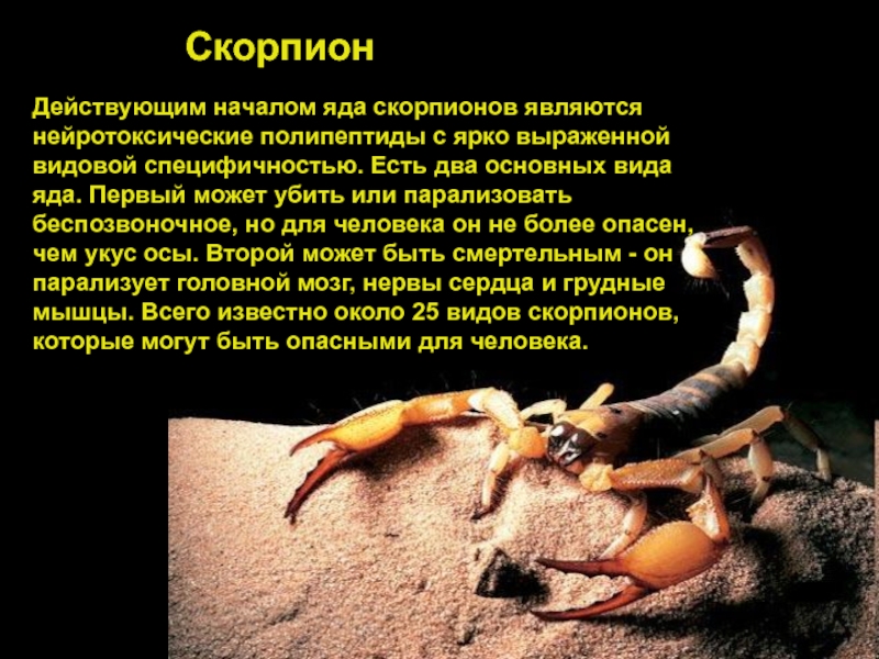 Яд сколопендр содержит ацетилхолин, серотонин, лецитин, гистамин, термолизины, гиалуронидазу. У человека их укусы вызывают местную опухоль и боль, продолжающуюся обычно 1—2 ч. , возможно повышение температуры, лихорадка, слабость.
