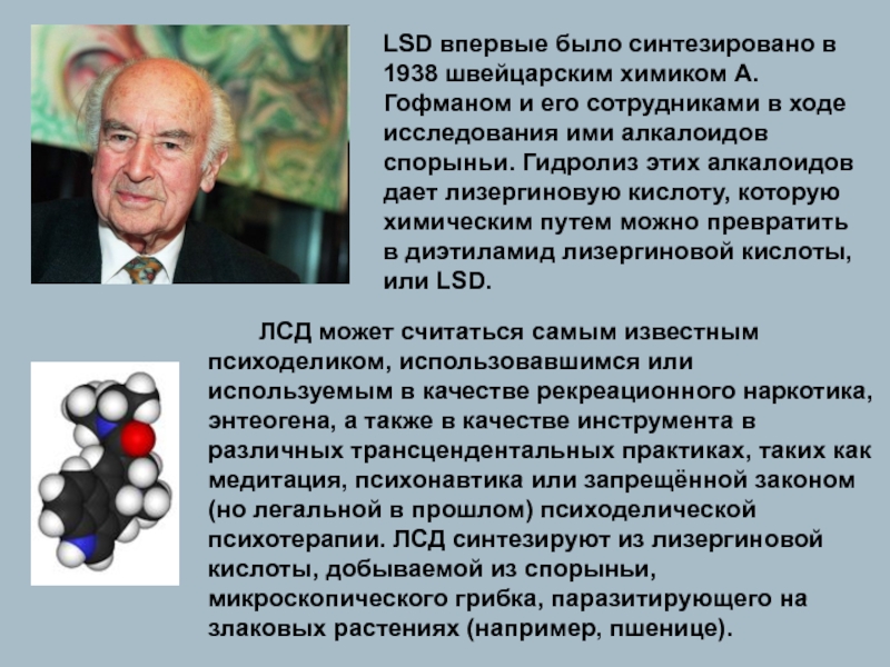 LSD впервые было синтезировано в 1938 швейцарским химиком А.Гофманом и его сотрудниками в ходе исследования ими алкалоидов спорыньи. Гидролиз этих алкалоидов дает лизергиновую кислоту, которую химическим путем можно превратить в диэтиламид лизергиновой кислоты, или LSD.