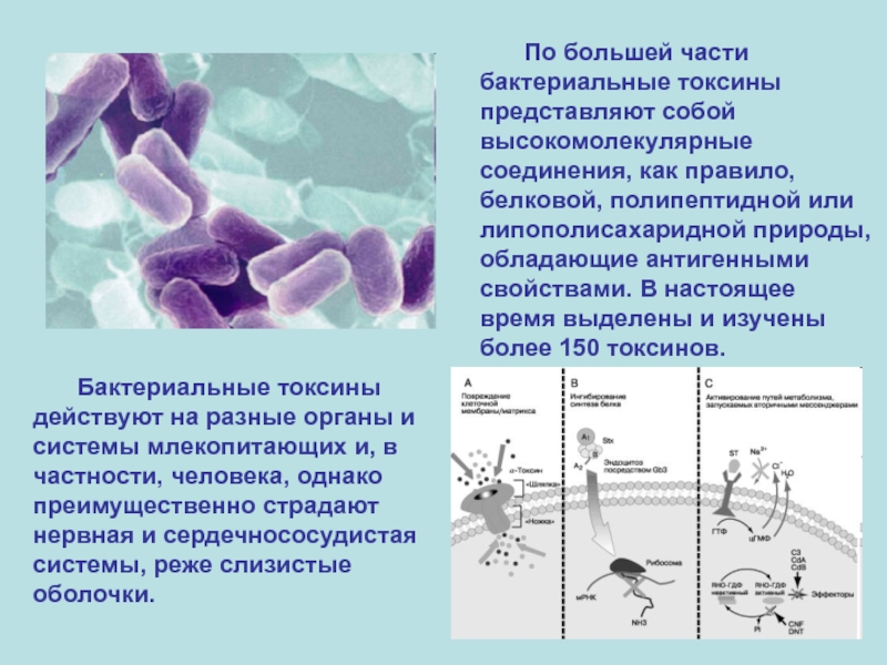 Бактериальные токсины действуют на разные органы и системы млекопитающих и, в частности, человека, однако преимущественно страдают нервная и сердечнососудистая системы, реже слизистые оболочки.