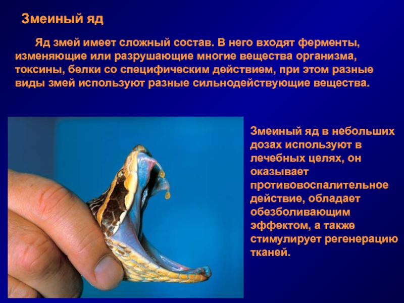 Яд змей имеет сложный состав. В него входят ферменты, изменяющие или разрушающие многие вещества организма, токсины, белки со специфическим действием, при этом разные виды змей используют разные сильнодействующие вещества.