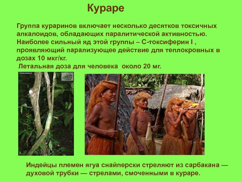 Группа кураринов включает несколько десятков токсичных алкалоидов, обладающих паралитической активностью. Наиболее сильный яд этой группы – С-токсиферин I , проявляющий парализующее действие для теплокровных в дозах 10 мкг/кг.
