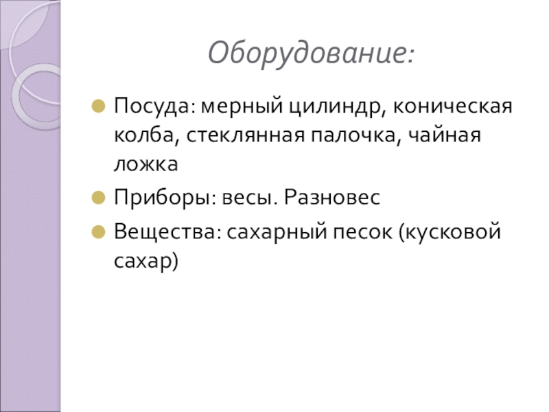 Оборудование:Посуда: мерный цилиндр, коническая колба, стеклянная палочка, чайная ложкаПриборы: весы. РазновесВещества: сахарный песок (кусковой сахар)