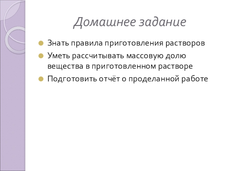 Домашнее заданиеЗнать правила приготовления растворовУметь рассчитывать массовую долю вещества в приготовленном раствореПодготовить отчёт о проделанной работе