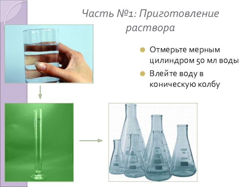 Часть №1: Приготовление раствораОтмерьте мерным цилиндром 50 мл водыВлейте воду в коническую колбу