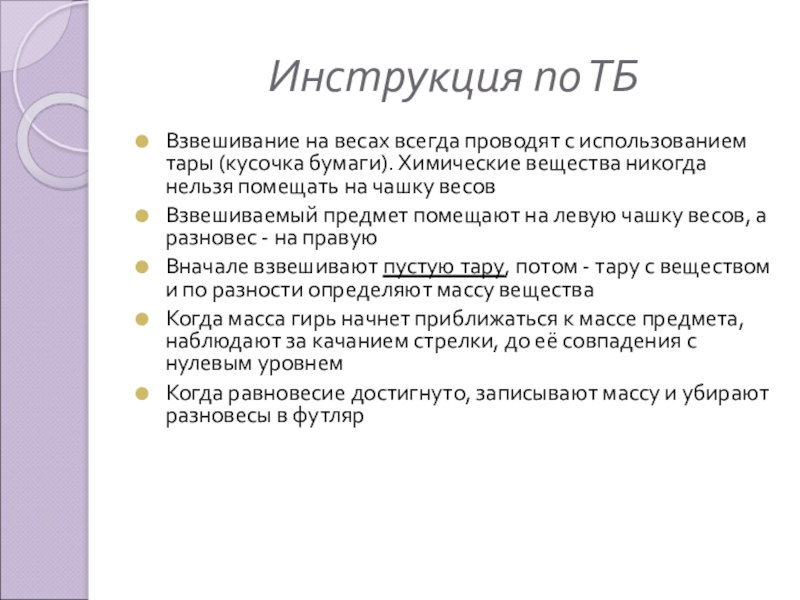 Инструкция по ТБВзвешивание на весах всегда проводят с использованием тары (кусочка бумаги). Химические вещества никогда нельзя помещать