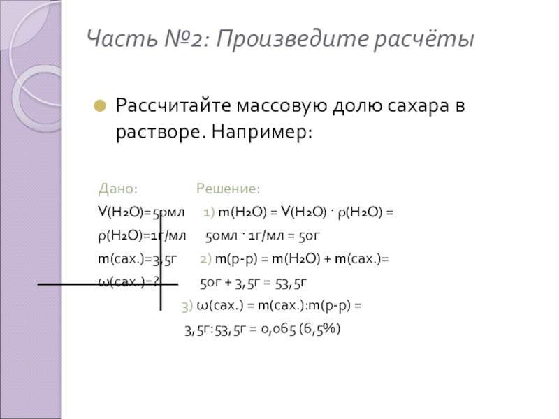 Часть №2: Произведите расчётыРассчитайте массовую долю сахара в растворе. Например: Дано: